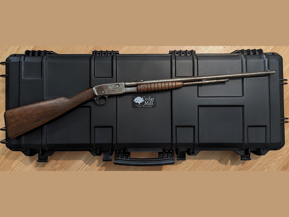 The Remington Model 12, introduced in 1909, was a popular pump-action .22 rifle for both small-game hunting and target shooting. It was well-balanced and featured a takedown design for easy cleaning and transport. Its tubular magazine allowed multiple rounds of .22 ammunition, making it a practical firearm for its time.