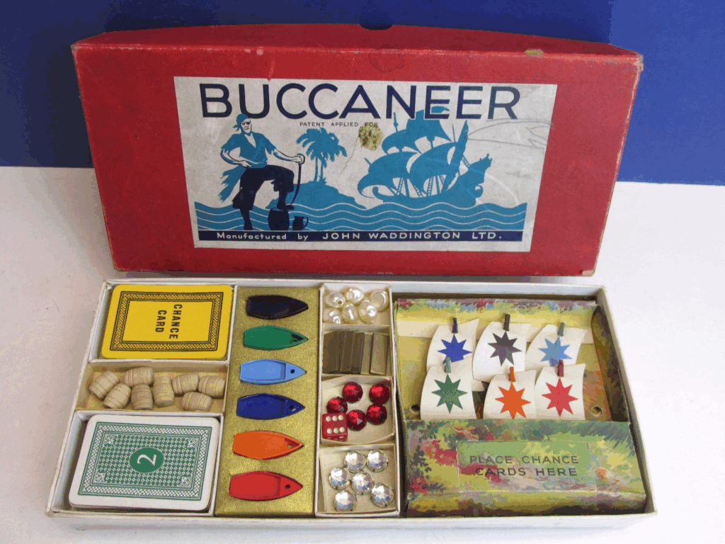 Buccaneer, originally released in the 1930s by Waddingtons, is a pirate-themed game that has become a rare collectible. The original edition features a roll-up canvas board, which is particularly sought after by collectors. A set in good condition can bring around $120 or more, especially if it includes the original treasure pieces and the full set of cards. The unique feature of this game is the canvas board, which gives it a distinctive look and feel compared to other board games of its time. The combination of rarity and thematic appeal makes it a desirable find for collectors.