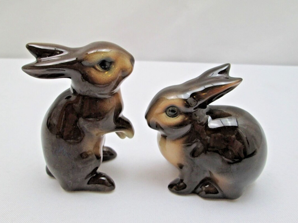A pair of tiny Napco rabbits with pink eyes gives a shelf a very classic mid-century spring look. These are generally described as hand-painted ceramic figures made in Japan and sold as a matched pair. Many people like paired rabbits because they fill a small space neatly and feel more complete than a single figure. A good working value is around $15 to $20 for the pair.