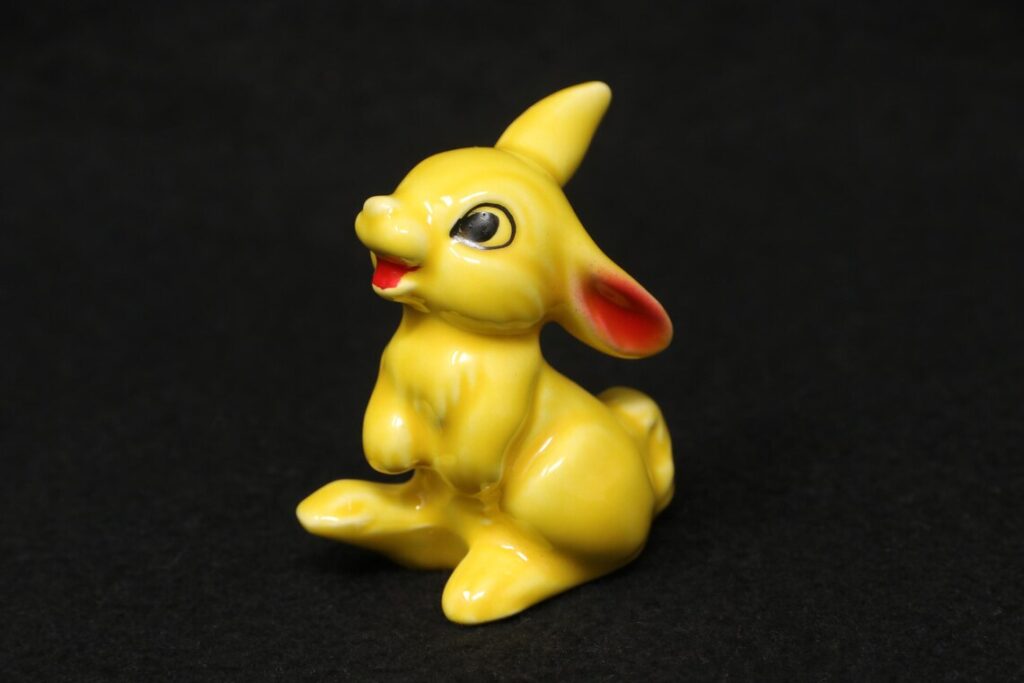 A yellow Goebel rabbit from the 1970s gives a collection a more cheerful color note. It is often described as a porcelain bunny made in Germany, usually around medium size, with a more playful Easter look than the quieter white or brown versions. That stronger color is a big part of what makes it memorable. A good estimate is about $18 to $28.