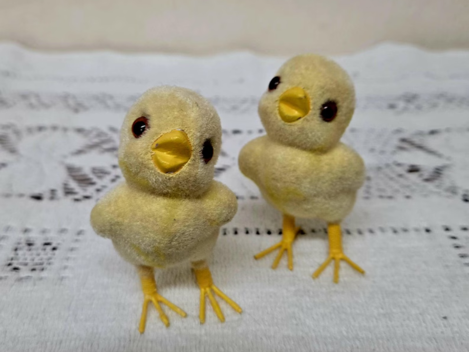 What makes them stand out is how closely they match the look of older Easter decor. Flocking often wears down over time, so fuller coverage usually means a better-looking pair. The larger eyes and decorative finish also give them more personality than plainer chick figures. When both birds still show good color and even flocking, they look much stronger on display.