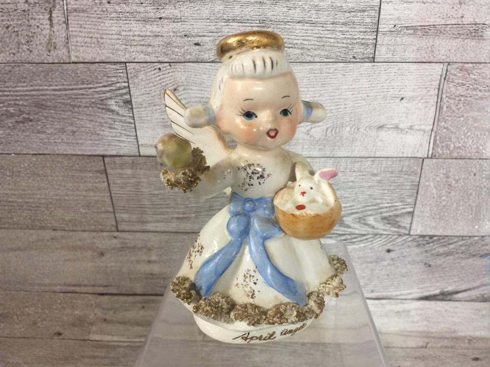 Some spring figurines stand out because they tell a little story, and this Lefton Easter angel with bunny does exactly that. It is typically described as a 1950s ceramic figure from Japan, with hand-painted details and a more decorative look than a plain rabbit. That extra scene work helps it appeal to people who like vintage holiday decor in general. A realistic value range is around $40 to $50.