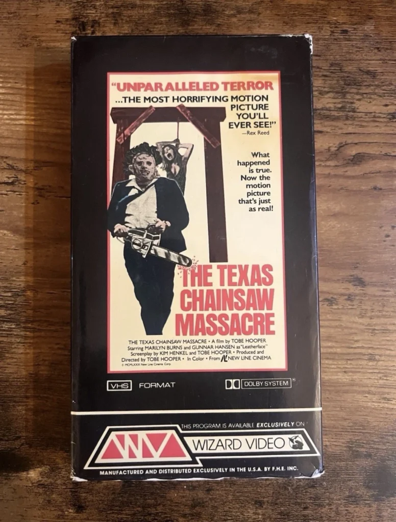 The Wizard Video big box release of The Texas Chain Saw Massacre is one of the most iconic horror VHS collectibles ever made. Its oversized packaging and lurid artwork instantly draw attention. Because it came out in limited numbers, finding one intact with the foam insert and sleeve is a major score. The film’s grainy picture on tape matches its raw, chaotic style perfectly.