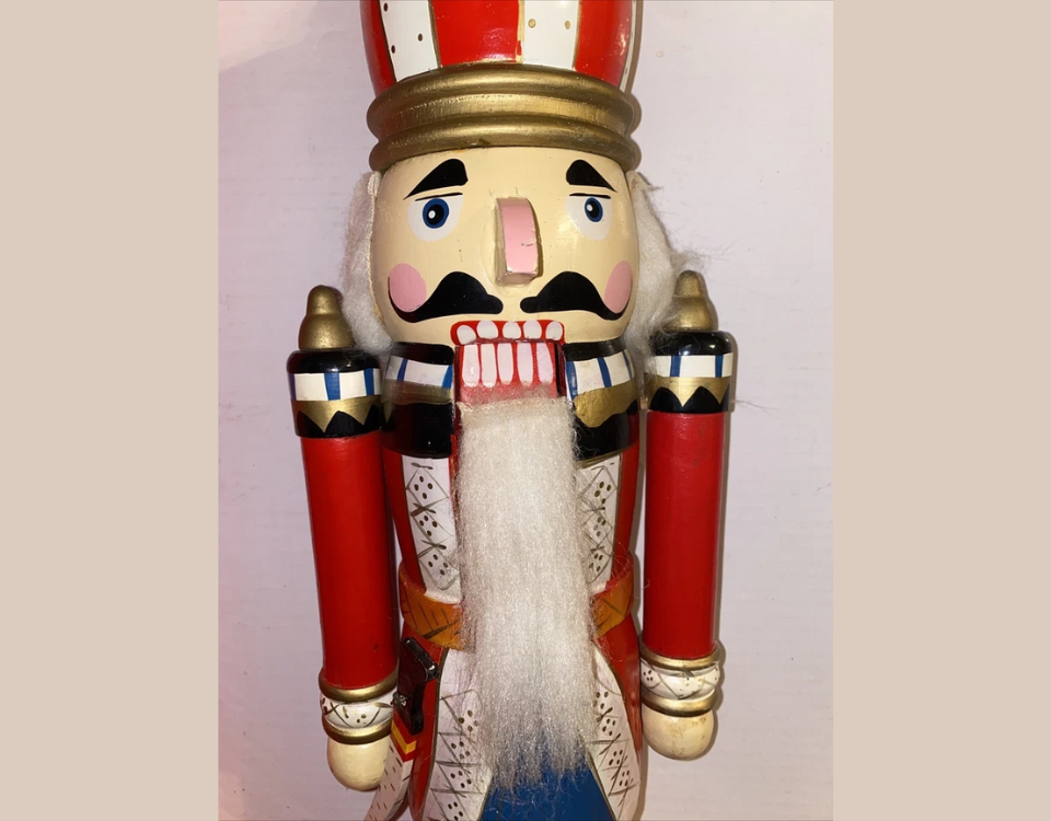 Made in 1952 by Goebel in West Germany this nutcracker reflects the style of a Hummel illustration. Collectors like it because it blends illustration and traditional form in a delightful way. A well kept piece can be around $450 today. It often brings a smile when placed near wreaths or festive lights.