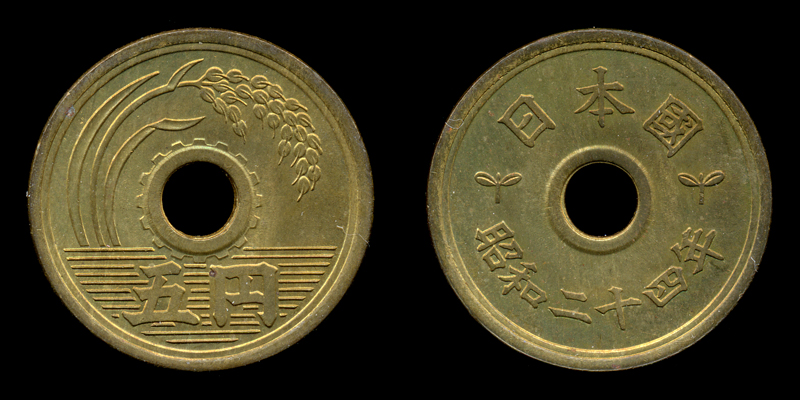 Japan introduced the 5 yen coin with a central hole in 1949. The hole changes the look and feel of the coin completely. Circulated examples often sell for $1 to $4. Better condition coins may cost more. The design remains in use today.