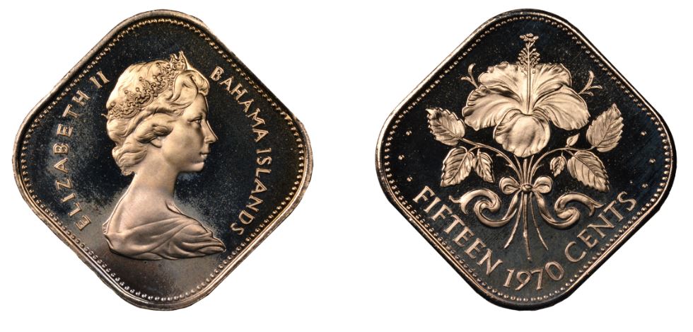 This Bahamas 15 cents coin uses a square shape with rounded corners, which makes it easy to recognize. The unusual outline separates it from most circulating coins. Prices often range from $2 to $10 depending on condition. Higher grade pieces may sell for more. The simple shape change gives it strong visual appeal.