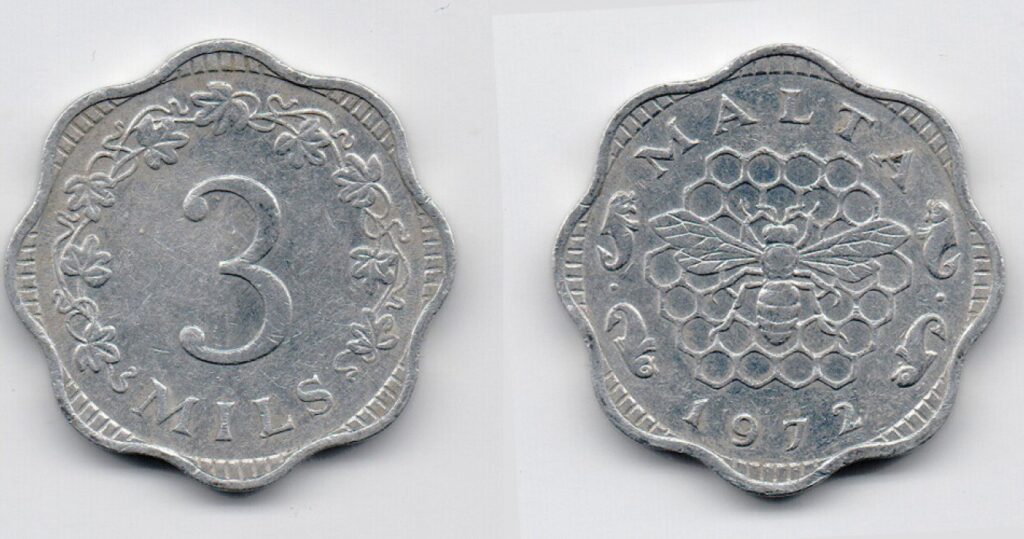 The Malta 3 mils coin dated 1972 uses an eight notch scalloped edge. The smaller number of notches gives it a softer look. Prices often range from $2 to $10. Condition plays a large role in value. It is a compact coin with a clear outline.