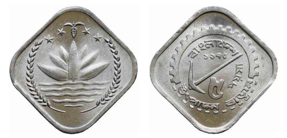 Bangladesh released the 5 poisha coin in 1974 with a square shape and rounded corners. The outline makes it instantly noticeable. Prices usually range from $1 to $5. Condition affects corner clarity. It is a simple yet eye-catching design.