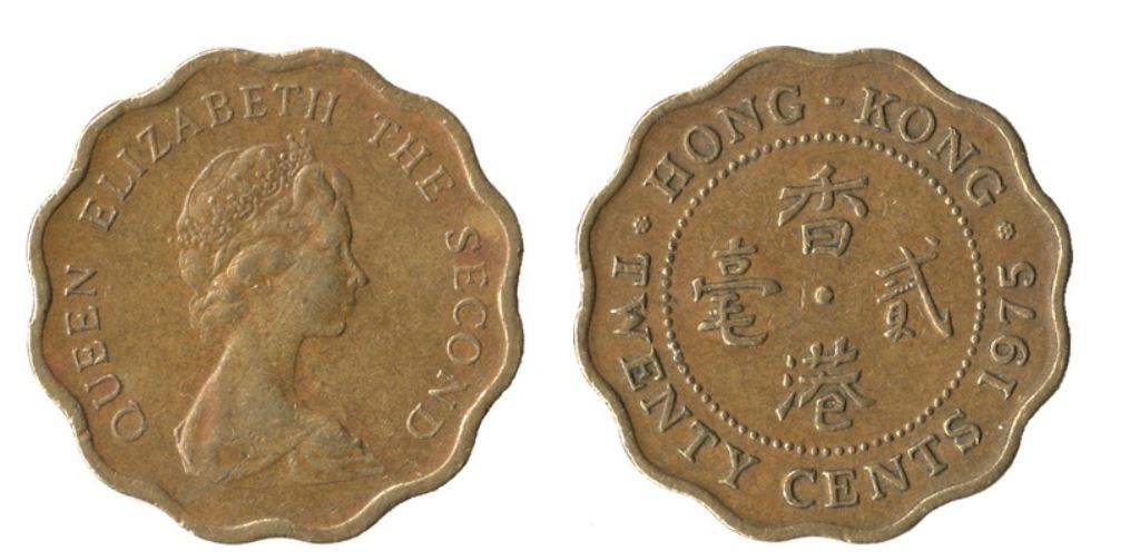 First issued in 1975, the Hong Kong 20 cents coin features twelve rounded notches around the edge. The scalloped rim gives it a gear-like appearance. Most examples sell for about $1 to $5. Coins with less wear usually sell for more. The shape helps it stand out despite its small size.
