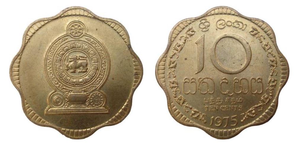 Sri Lanka issued this 10 cents coin in 1975 with an eight notch scalloped edge. The outline gives it a rounded floral look. Prices often fall between $1 and $6. Better condition pieces may cost more. It offers a softer alternative to higher notch counts.