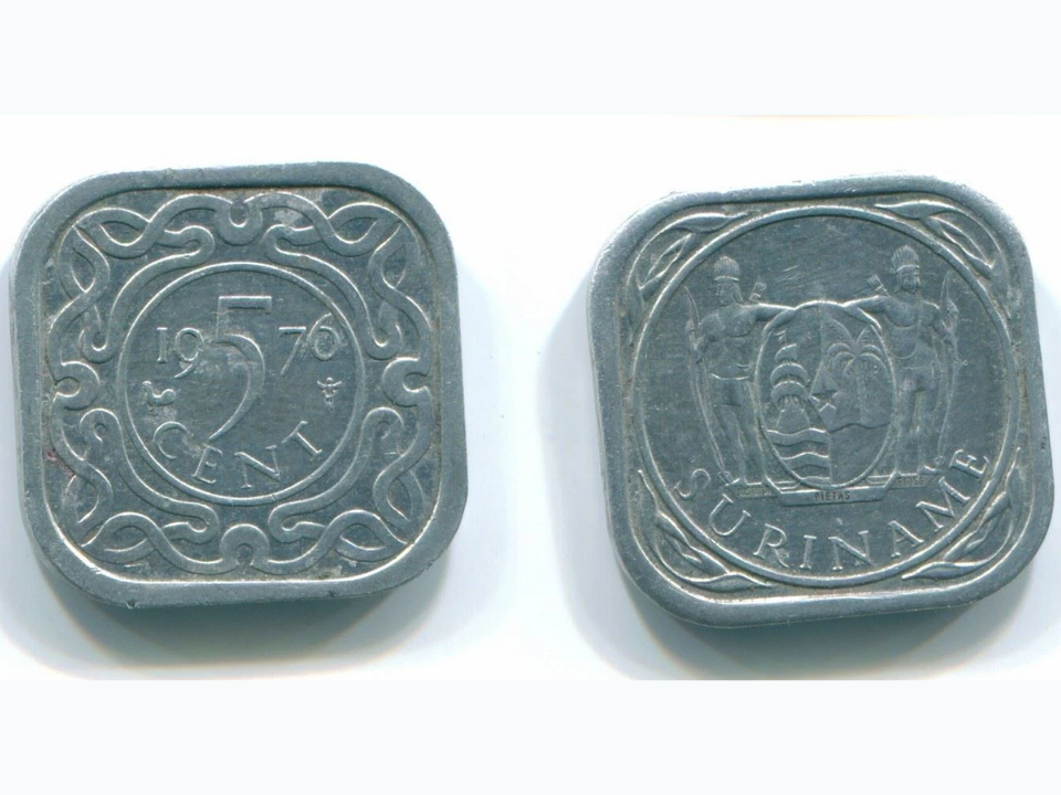 Suriname released this 5 cents coin with a square shape and rounded corners starting in 1976. The outline makes it easy to spot in mixed lots. Prices usually range from $1 to $6. Coins with less wear may sell for more. It offers an affordable entry into odd shapes.