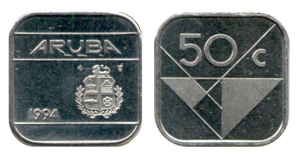Aruba issued this 50 cents coin in 1986 with a square shape and rounded corners. The shape makes it resemble a small tile. Prices usually fall between $2 and $8. Cleaner examples may sell for more. The coin works well in modern world collections.