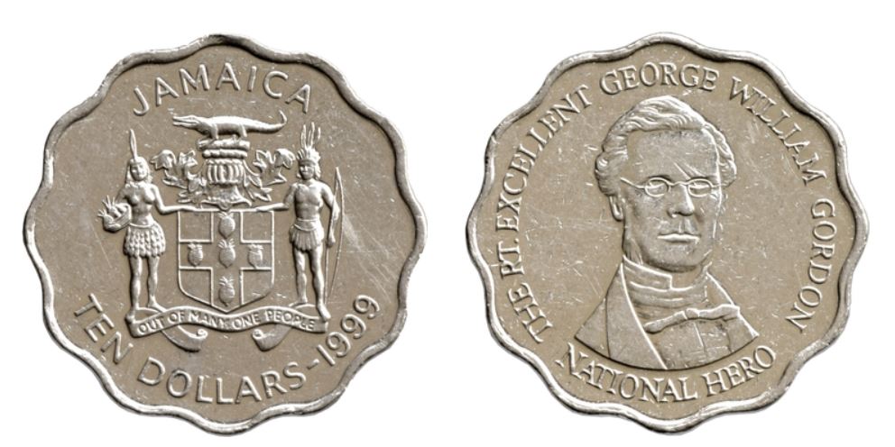 Jamaica released this 10 dollars coin with a twelve notch scalloped edge. The shape gives it a floral appearance. Circulated examples often sell between $2 and $8. Coins with lighter wear may cost more. The outline helps distinguish it from other Jamaican coins.