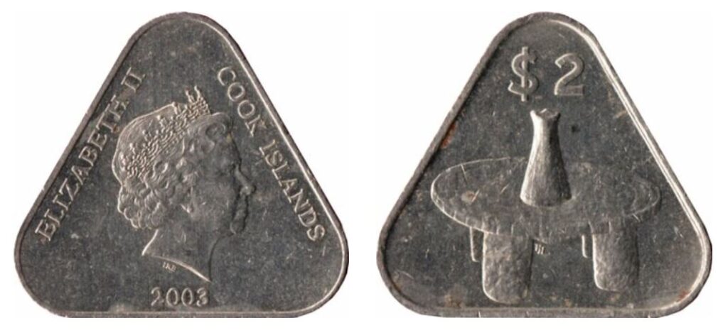 Issued beginning in 2003, this Cook Islands 2 dollars coin features a triangular shape. The outline is the main reason it draws attention. Typical prices range from $3 to $15 depending on condition. Some versions were issued with different themes. The shape makes it stand apart from polygon coins.