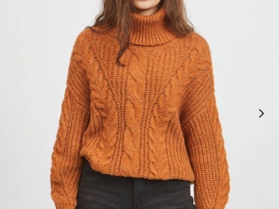 The cable knit pattern has raised twist‑and‑loop detailing across the body and sleeves which brings texture and dimension. That kind of structure works well with makeup that features earth‑tones or warm metallics because the sweater’s stitch work reflects light in interesting ways and complements browns, coppers or bronzes on your eyes. With a nude or soft peach lip and minimal eye liner, this sweater helps your face stay central while you retain a relaxed, polished appearance.