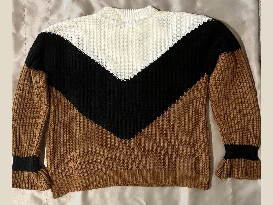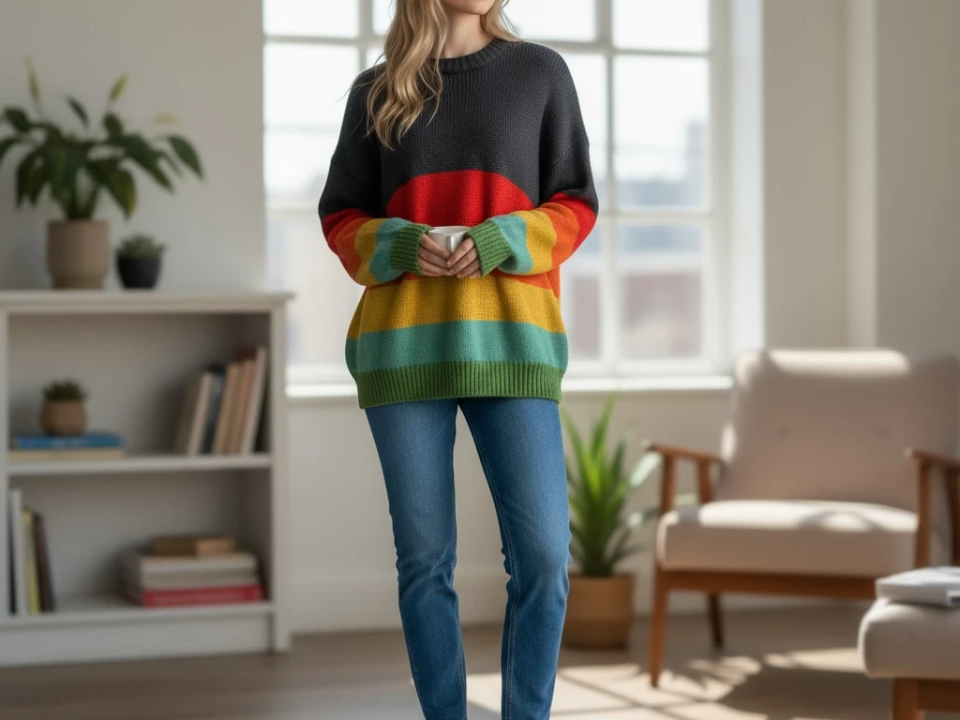 A colorblock sweater features contrasting blocks of colour which give visual interest and energy to your outfit. With this kind of sweater you can align one of the block tones with an element of your makeup, for example if one block is a deep forest green, wear green‑tinged eyeliner, or if another block is mustard, use a warm gold shadow. The playful split of colours means your makeup can be slightly more adventurous while still remaining coherent with the outfit.