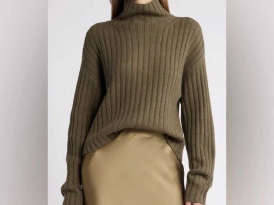 This sweater features a thick knit and high neckline that gives both warmth and form. The rich, tactile texture adds character to your outfit and frames the lower half of your face, which means your lips and cheeks draw attention naturally. Because of the high neck, your makeup becomes a more prominent part of the look, so opting for a deep berry lip or a warm smoke eye makes sense in this setting.