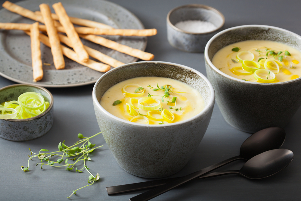 Use 2 tablespoons butter, 3 leeks sliced and rinsed well, 2 minced garlic cloves, 1 pound potatoes peeled and diced, 5 cups chicken broth, 1 cup milk, plus salt and pepper. Cook leeks in butter until soft, then add garlic and stir for 30 seconds. Add potatoes and broth, simmer about 20 minutes until very tender, then blend smooth. Stir in milk, season, and warm gently before serving.