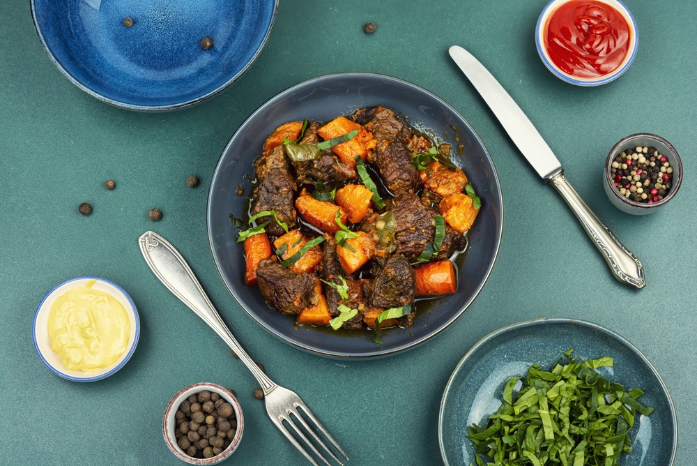 For ingredients, use 2 pounds of beef chuck cut into 1-inch cubes, 2 tablespoons olive oil, 1 chopped onion, 3 minced garlic cloves, 2 tablespoons of tomato paste, 2 tablespoons flour, 2 cups red wine, 3 cups beef broth, 3 sliced carrots, 2 diced potatoes, 2 bay leaves, 1 teaspoon of dried thyme, plus salt and pepper. Brown the beef in a heavy pot, then set it aside and cook the onion and garlic in the same pot. Stir in tomato paste and flour, then pour in wine and broth and scrape up the browned bits. Add beef, carrots, potatoes, bay leaves, thyme, and seasoning, then cover and simmer for about 1 hour and 45 minutes until tender.