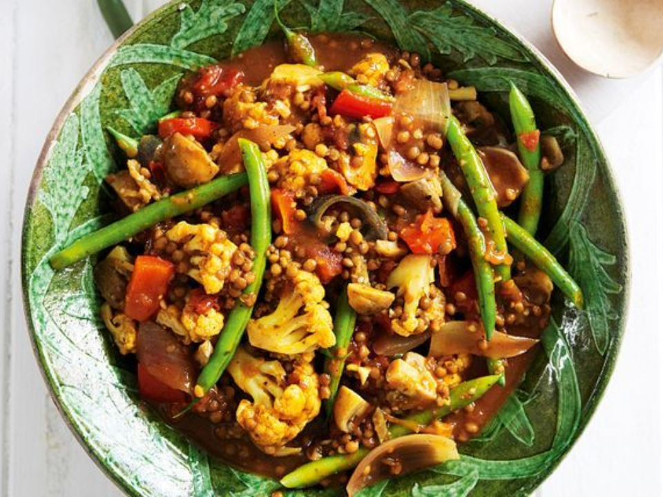 You will need 1 tablespoon oil, 1 chopped onion, 2 minced garlic cloves, 1 tablespoon of grated ginger, 2 teaspoons of curry powder, 1 teaspoon ground turmeric, 1 cup red lentils rinsed, 1 can diced tomatoes 14 ounces, 1 can coconut milk 13 to 14 ounces, 2 cups vegetable broth, 2 cups spinach, plus salt and lemon wedges. Cook the onion in oil, then add the garlic and ginger and stir for 1 minute. Add spices, lentils, tomatoes, coconut milk, and broth, then simmer about 18 minutes until lentils are soft. Stir in spinach and salt, then serve with rice or flatbread and finish with lemon.