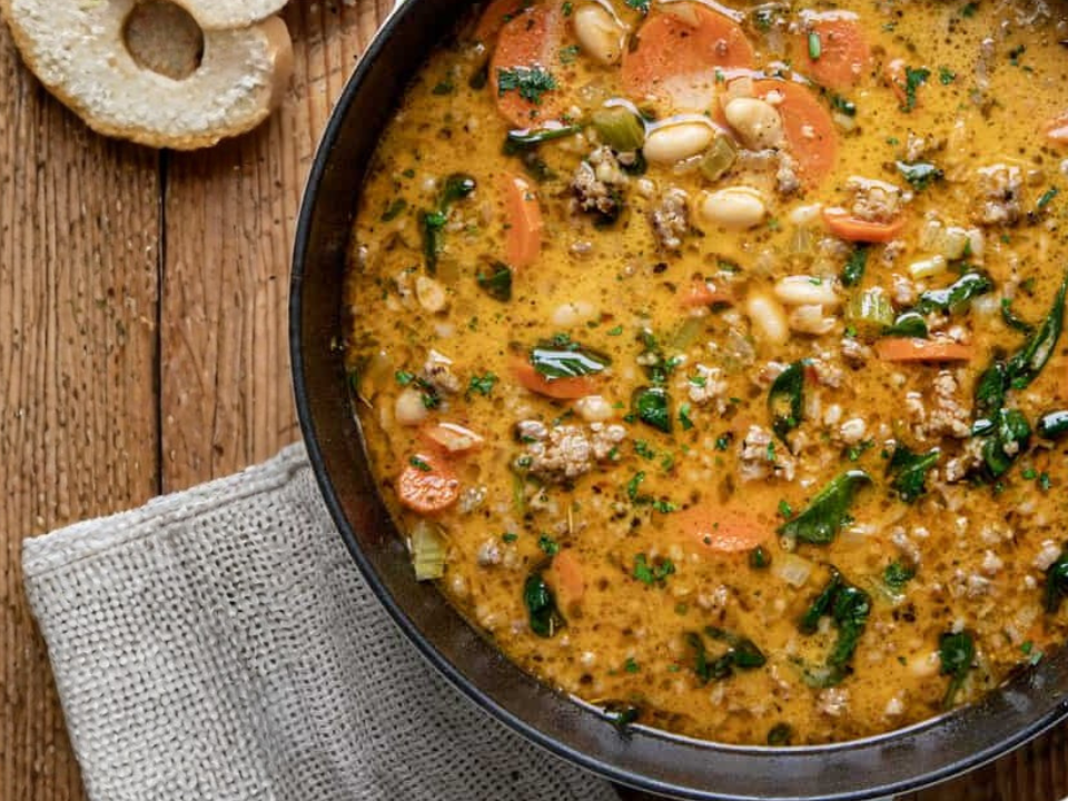 Measure 1 tablespoon olive oil, 1 pound Italian sausage, 1 chopped onion, 3 minced garlic cloves, 1 teaspoon dried oregano, 6 cups chicken broth, 2 cans cannellini beans 15 ounces each drained, 1 cup chopped carrots, 2 cups chopped kale, 1 tablespoon lemon juice, plus salt and pepper. Brown the sausage in a pot, then add the onion and cook until soft, followed by the garlic for 30 seconds. Pour in broth, add beans and carrots, then simmer 20 minutes. Stir in kale for 5 minutes, then finish with lemon juice, salt, and pepper.