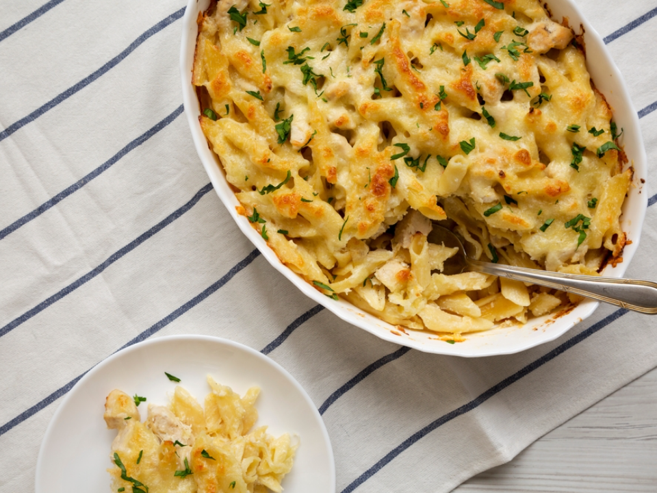 For this recipe, cook 2 cups of penne pasta according to the package instructions. In a separate pan, cook 2 chicken breasts and slice them into strips. In a large bowl, mix the cooked pasta, chicken, 2 cups of Alfredo sauce, and 1 cup of shredded mozzarella. Pour into a baking dish and top with an additional ½ cup of mozzarella and Parmesan cheese. Bake at 350°F for 20–25 minutes until the top is golden and bubbly.