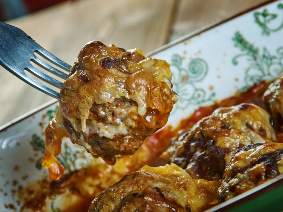 To prepare, layer 2 cups of cubed bread in the bottom of a baking dish. Top with 12 cooked meatballs, 2 cups of marinara sauce, and 2 cups of shredded mozzarella cheese. Repeat the layers, finishing with cheese on top. Bake at 375°F for 25–30 minutes, until the cheese is bubbly and golden.