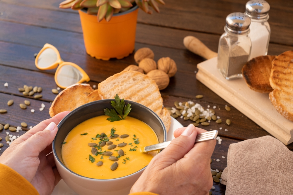 For a savory, warming option, create a harvest soup and bread board. Choose a selection of seasonal soups like pumpkin, butternut squash, or roasted tomato and basil. Arrange bowls of soup on the board, surrounded by various types of bread for dipping, such as crusty baguettes, soft rolls, and rustic multigrain loaves. Add a variety of spreads like garlic butter, herb-infused oils, or creamy cheese spreads to complement the soups. You can also include roasted nuts or a light salad to add some freshness to the board. To make it even more festive, sprinkle roasted pumpkin seeds on top of the soups or garnish with fresh herbs like sage or parsley.