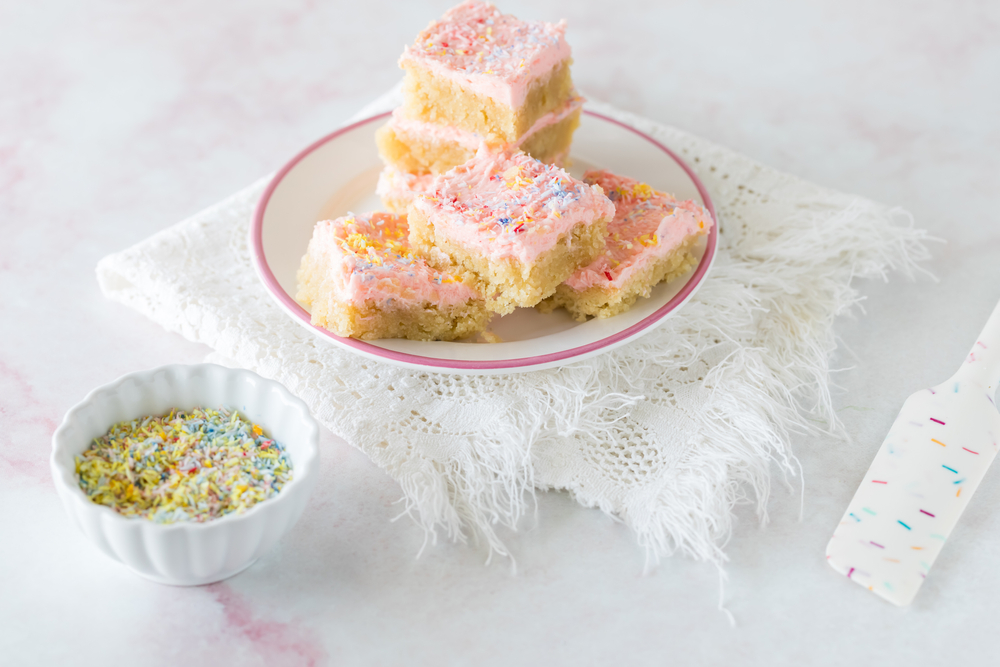 For sugar cookie bars, you will need all-purpose flour, baking powder, salt, unsalted butter, granulated sugar, eggs, vanilla extract, and a little milk. Mix the dry ingredients in one bowl, and beat the butter and sugar together in another. Add the eggs and vanilla, then combine the wet and dry ingredients. Spread the dough into a baking dish and bake at 350°F (175°C) for about 20-25 minutes. Once cooled, frost with your favorite frosting and cut into squares.