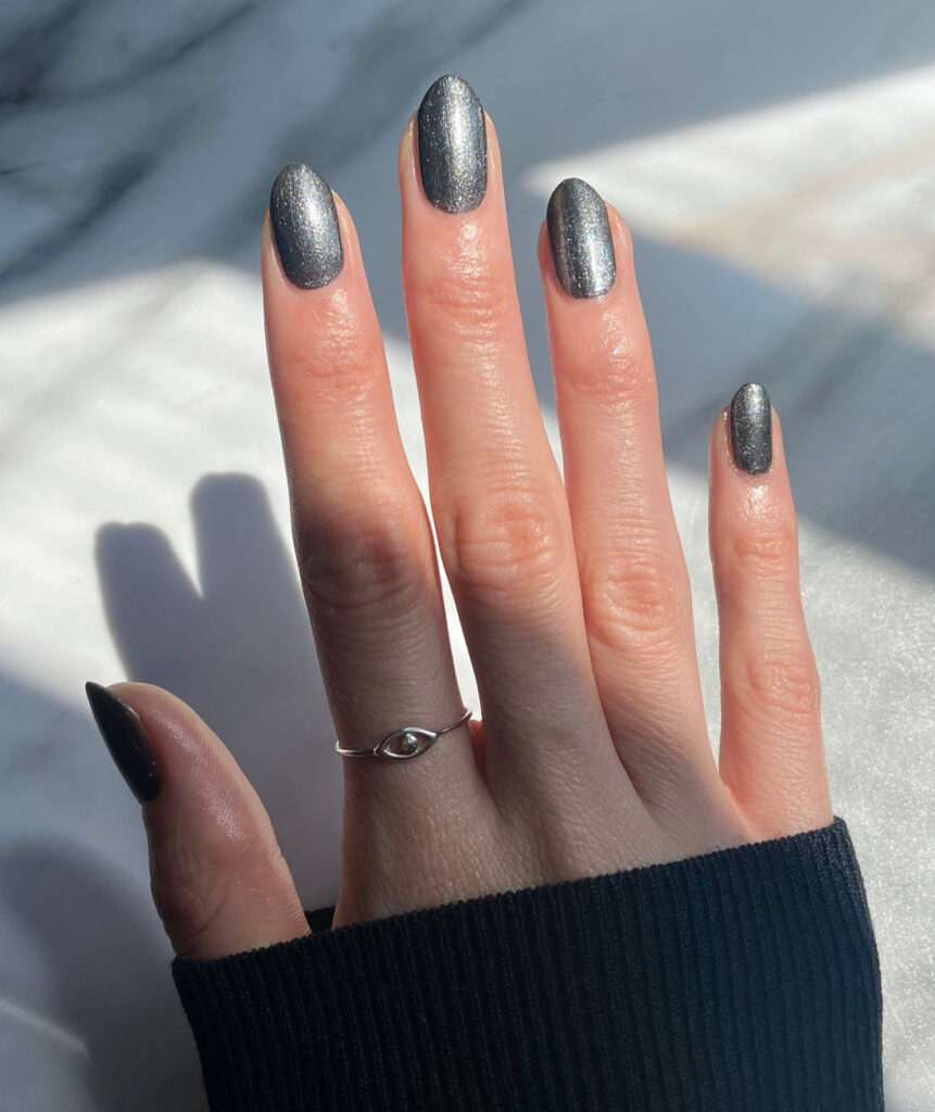 This shade often feels modern and refined. It hides chips better than lighter metallics. Gunmetal looks clean on shorter nails. The shimmer shows best under soft lighting. It remains popular throughout the season.