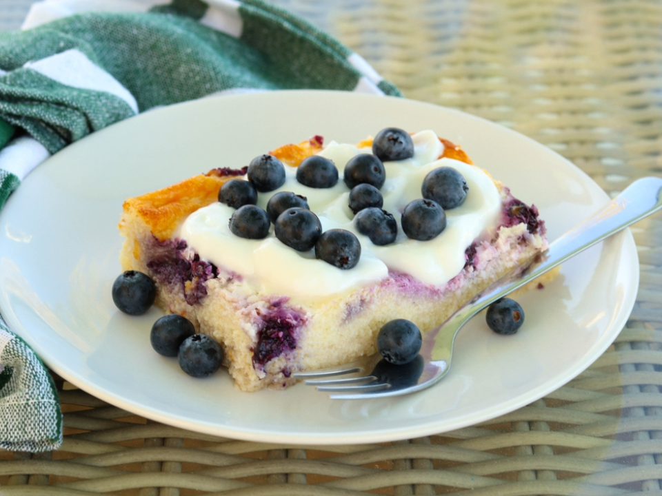 In one bowl, whisk 1/2 cup plain yogurt, 1/2 cup oil, 3/4 cup sugar, 2 eggs, and 1 teaspoon vanilla extract until well blended. Stir in 1 1/2 cups all purpose flour, 1 1/2 teaspoons baking powder, and 1/4 teaspoon salt, then fold in 1 cup fresh or frozen blueberries. Pour the batter into a greased 8 inch round pan and bake at 350°F for 32 to 38 minutes. Let it cool before slicing, and dust the top with powdered sugar if you want a light finish.