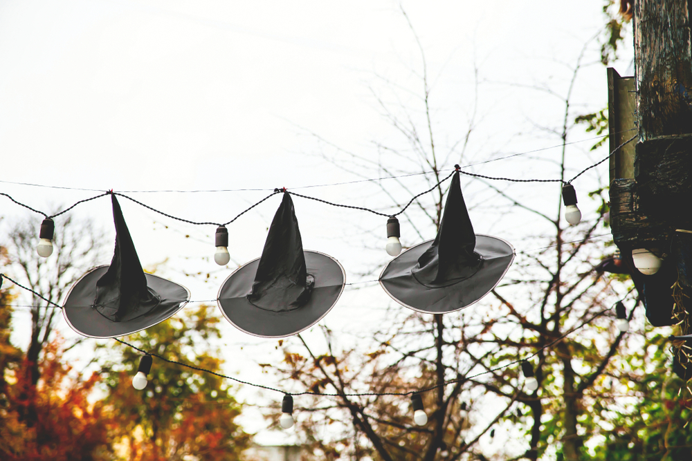 Floating witch hats are a fun and eerie decoration that will give your yard a whimsical yet spooky vibe. To create them, use black witch hats and suspend them from tree branches or your porch ceiling using fishing line. The illusion of floating hats will give your space a magical touch, as though witches are preparing to swoop down. You can even add string lights inside the hats to make them glow at night.