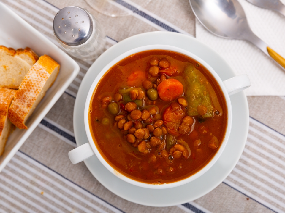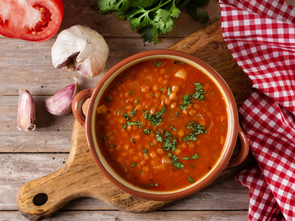 Red lentil and tomato soup feels silky and thick even without cream. Lentils cook quickly and break down, which gives the soup a smooth body. Tomatoes and gentle spices make it bright and warming. It is a handy choice when you want a quick, filling meal.