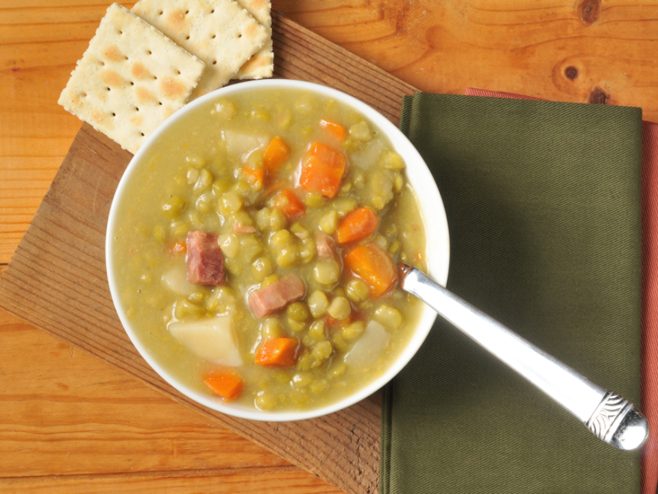 Split pea soup feels rich and thick, almost like a sauce in a bowl. Carrots and onions bring flavor and color, while the peas break down and create a creamy texture. It is a classic low cost meal that keeps you full for hours. Leftover soup freezes well for another day.