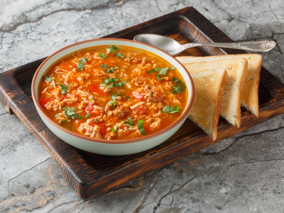 Stuffed pepper inspired soup carries all the flavors of baked stuffed peppers in a cozy bowl. Ground meat, rice, and bell peppers make it feel hearty and satisfying. The rice soaks up tomato broth and turns the soup thick. A small sprinkle of cheese on top reminds you of classic stuffed peppers.