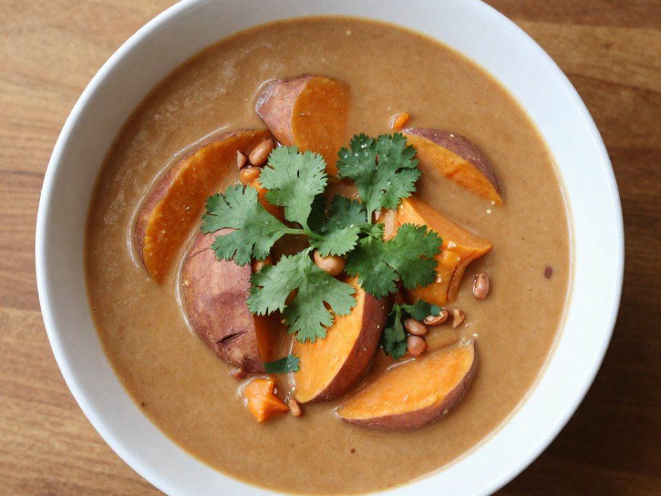 Peel and cube 2 large sweet potatoes. In a large pot, heat 1 tablespoon of oil, cook 1 diced onion for 5 minutes, then add 3 minced garlic cloves and 1 teaspoon of ground cumin. Add the sweet potatoes, 5 cups of water or broth, and 1 teaspoon of salt, simmer for about 20 minutes until the sweet potatoes are tender, then stir in a half cup of peanut butter off the heat and blend the soup with an immersion blender until smooth. Return to low heat, adjust seasoning, and warm gently before serving.
