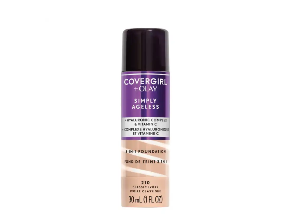 For complexions with more visible lines, CoverGirl plus Olay Simply Ageless is a frequent pick. This foundation combines color with a hyaluronic complex and vitamin C to support hydration and brightness. The creamy texture helps it glide over crow’s feet and smile lines rather than sinking into them. Its finish looks softly radiant, which tends to flatter mature skin.