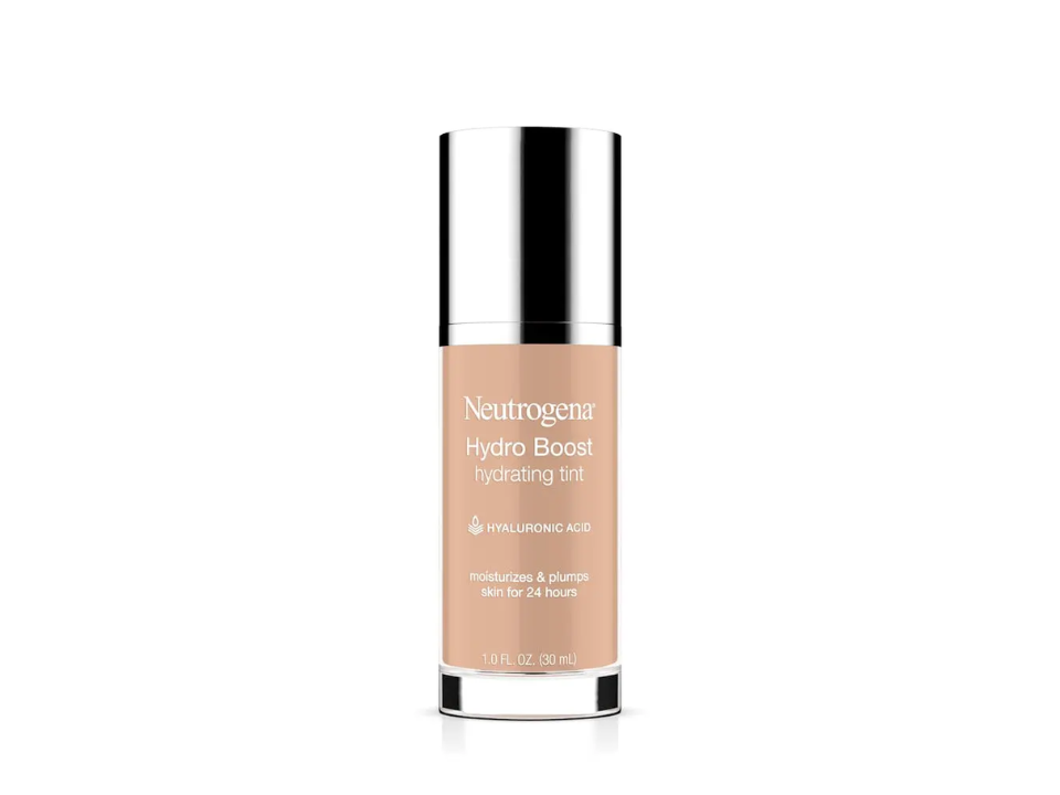 For a base that feels close to skincare, Neutrogena Hydro Boost Hydrating Tint is a strong choice. The formula focuses on hyaluronic acid and glycerin, ingredients that pull water toward the outer layers of the skin. Its gel-like texture makes it easy to spread in a thin layer, so it blurs rather than gathers in creases. The coverage is on the sheer side, which helps your skin still look like skin.