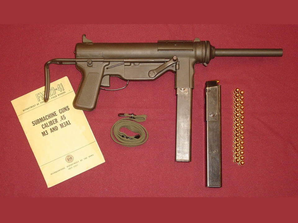 Developed during World War II as a low-cost alternative to the Thompson submachine gun, the M3 Submachine Gun became one of the most iconic automatic weapons of the war. It’s simple design featured a stamped metal body and a straight blowback mechanism, which kept production costs low while maintaining reliability. The M3 was chambered in .45 ACP and had a relatively low rate of fire compared to other submachine guns but was still highly effective in close-range combat.