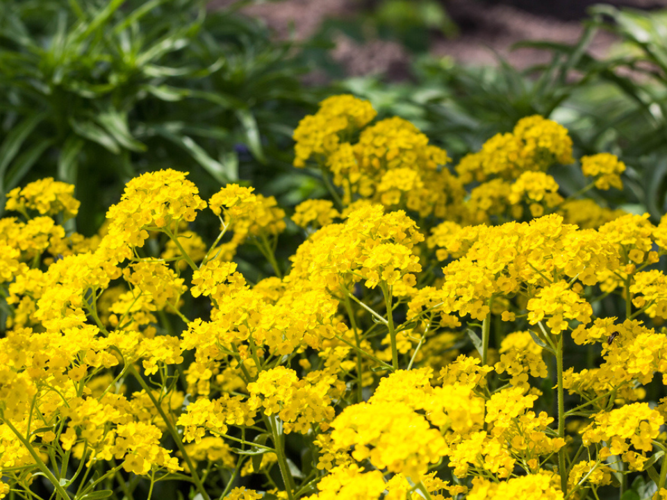 Basket of Gold is a sunny perennial that lives up to its name with masses of golden-yellow flowers in spring. It makes a wonderful choice for rock gardens, retaining walls, and dry slopes because it likes sharp drainage and plenty of sun. The gray-green foliage gives it a soft look even before it starts blooming, so it never feels dull.