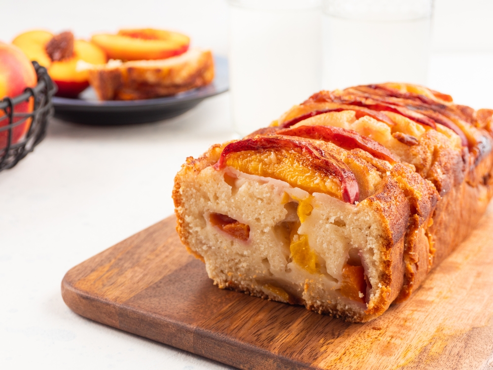 Ingredients and Preparation: Start by combining 2 cups of flour, 1 teaspoon of baking powder, ½ teaspoon of baking soda, and ½ teaspoon of salt in a bowl. In another bowl, whisk together 2 eggs, 1 cup of sugar, ½ cup of vegetable oil, and 1 teaspoon of vanilla extract. Gently fold in 1 ½ cups of diced peaches. Add the wet ingredients to the dry ingredients and mix until just combined. Preheat your oven to 350°F and grease a loaf pan. Pour the batter into the pan and bake for about 55-60 minutes, or until a toothpick inserted comes out clean. Let the bread cool for a few minutes before transferring to a wire rack.