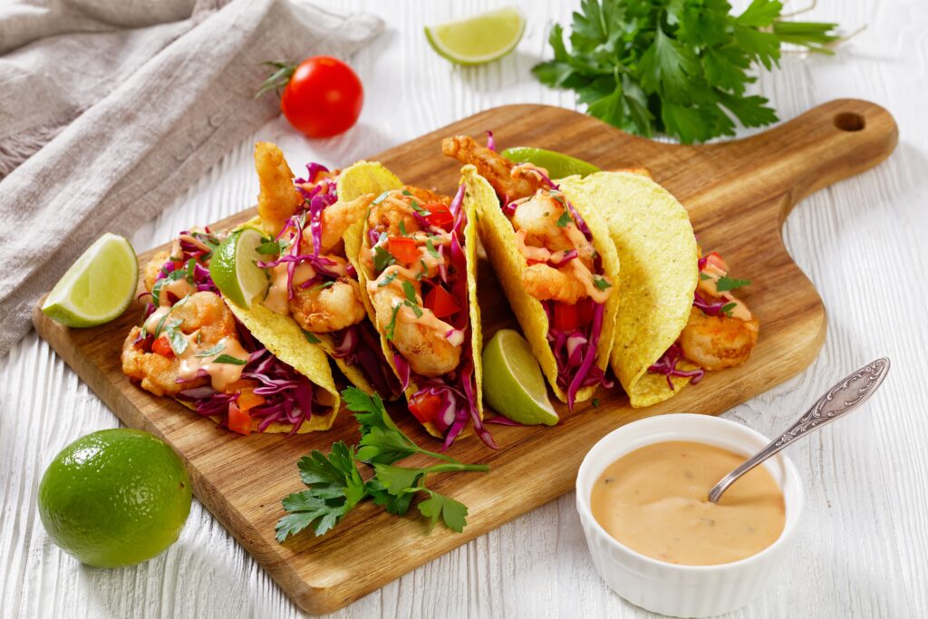 Shrimp Tacos With Cabbage Slaw and Lime Crema