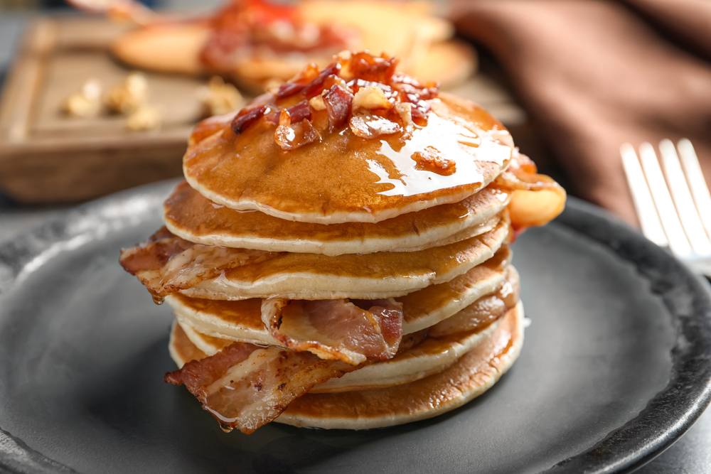 Prepare the pancake batter according to the instructions, adding cinnamon for a fall twist. Cook the bacon until crispy, then chop it into small pieces. Pour the pancake batter onto a hot griddle and sprinkle the bacon bits over the top before flipping. Serve the pancakes with a drizzle of maple syrup and a pat of butter.