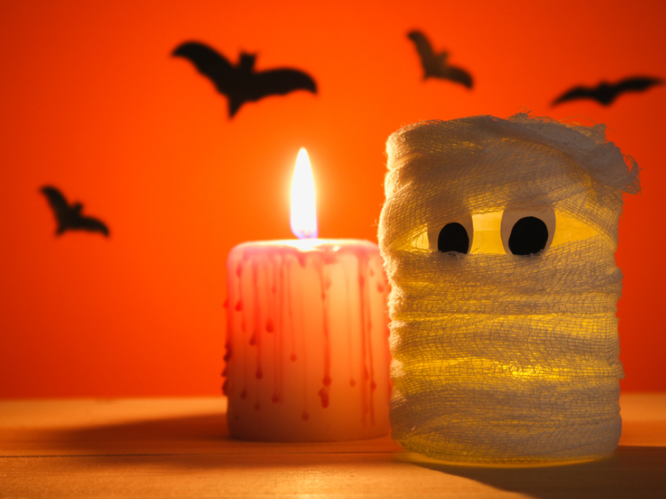 Transform your regular candle holder into mummies with just a few strips of white gauze or cloth. Wrap the cloth around the base of the candle and leave a few ends hanging for that signature mummy look. You can add googly eyes or small plastic spider decorations to complete the look.