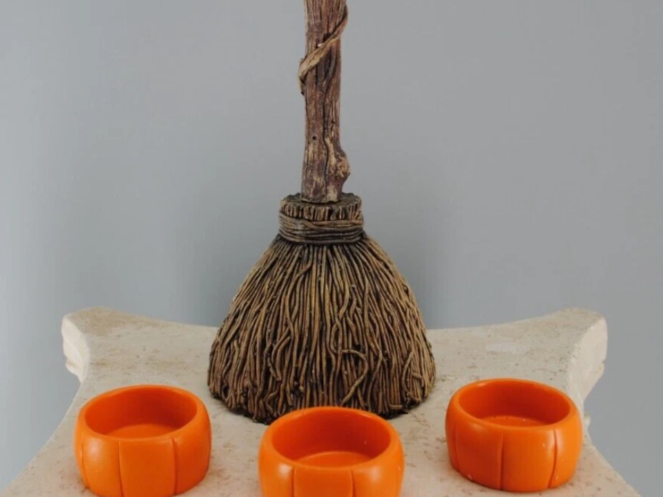 This witch’s broom centerpiece can easily be placed in the center of your dining table or on a coffee table to bring some Halloween fun into your living space. If you want to get a little more creative, consider adding small witches’ hats or cobwebs for an even spookier effect. It’s a simple and festive way to set the tone for a Halloween-themed dinner or gathering.
