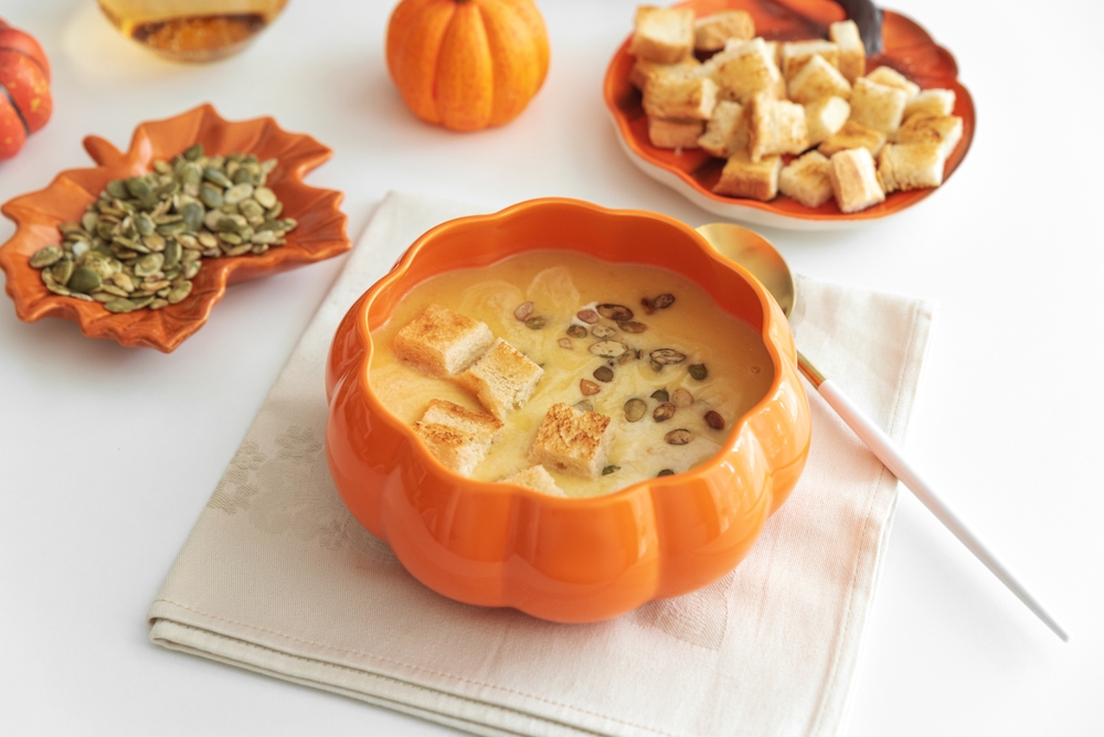 Pumpkin soup is a velvety, slightly sweet soup with a rich, comforting texture. Begin by sautéing 1 chopped onion and 2 minced garlic cloves in 2 tablespoons of olive oil until soft and fragrant. Add 3 cups of vegetable broth, 2 cups of pumpkin puree, and 1 teaspoon of ground ginger and cinnamon to the pot. Bring the mixture to a simmer and let it cook for about 15 minutes to allow the flavors to develop. Stir in ½ cup of heavy cream or coconut milk for a creamier texture and season with salt and pepper to taste.