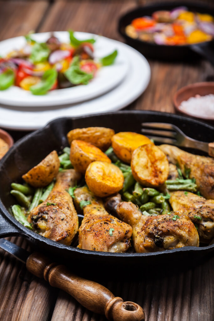 This is a cozy dinner that still fits warm weather because it feels easy and not fussy. Sweet potatoes roast into tender chunks with browned corners. BBQ sauce caramelizes on the chicken, and green beans cook right alongside everything.