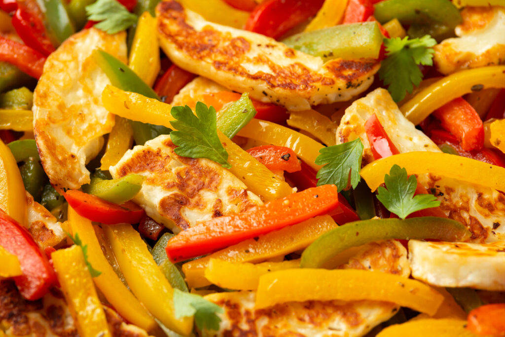 This is a great meatless dinner that still feels filling. Halloumi turns golden and chewy, while the vegetables roast until sweet. Chickpeas crisp on the pan and soak up the seasoning, so every bite has texture.