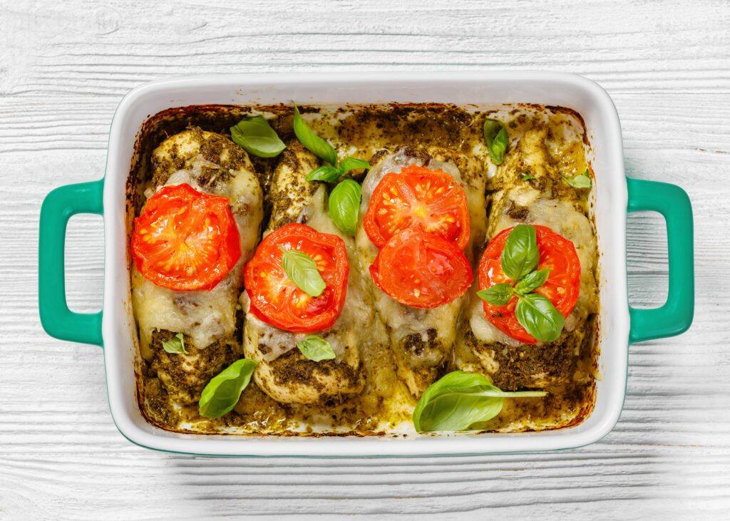 This dinner tastes like summer because it is herby, juicy, and a little cheesy. Pesto keeps the chicken moist while it roasts. Tomatoes soften into a quick sauce, and mozzarella melts into little pockets.