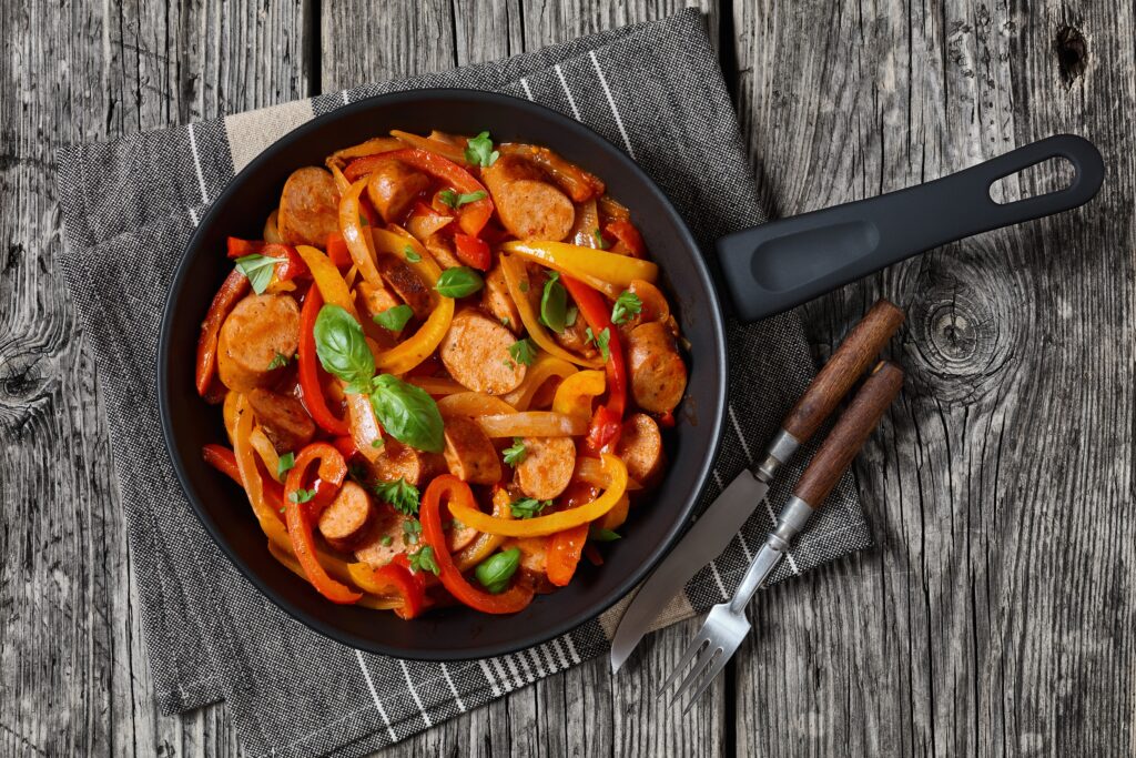 This is the kind of dinner that tastes like something you would order at a casual spot, yet it comes together fast at home. The sausage gets browned, the peppers turn sweet, and the onions soften into little ribbons. It is great on its own or piled into warm rolls.